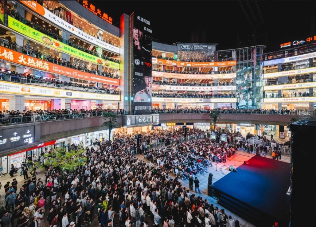 10月14日,2025《英雄联盟》全球总决赛开赛,光谷步行街迎来了首个观赛高峰。从午后开始,人流不断向喷泉广场汇集,最终在巨型LED屏幕下形成一片望不到边际的人海。所有毗邻的街道、楼梯甚至远处的天桥,都站满了人。
