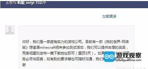 8月25日,Minecraft贴吧的多位吧主收到了自称“某实力公司”的私信,称希望在该贴吧中发布《我的世界-网络版》的测试活动信息,并征求吧主合作发布下载地址置顶3天。