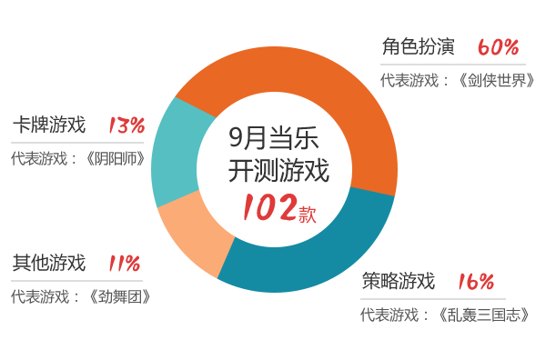 游戏观察10月17日消息,近日,当乐游戏中心发布了9月手游数据。本月开测的游戏数量达102款,相比上月下降近13%。本月游戏类型格局大洗牌,角色扮演强势出击,一举轰下60%的份额,其余各类均跌落至20%以下。