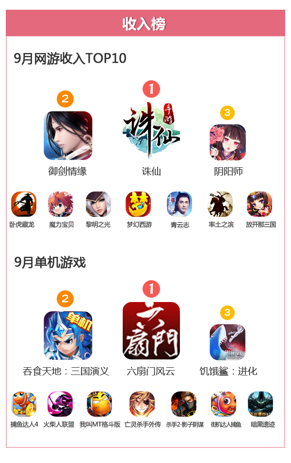本月的网游和单机收入的冠军分由《诛仙》和《六扇门风云》摘得。网游方面,《阴阳师》位居第三,榜首位置志在必得,只是时间的问题。而单机方面,《六扇门风云》《饥饿鲨:进化》等旧作依然霸榜,这也说明国产单机游戏缺乏更多的厂商扶持。