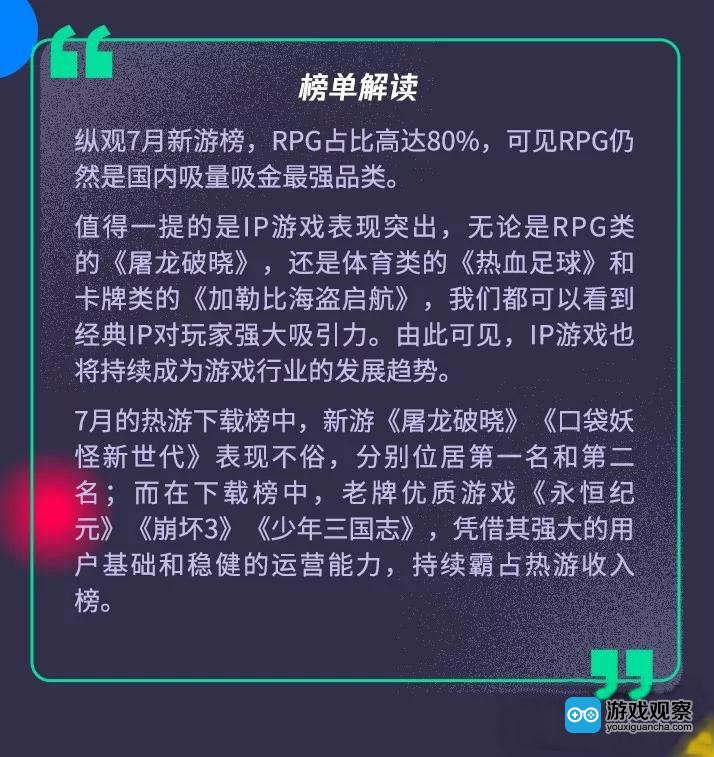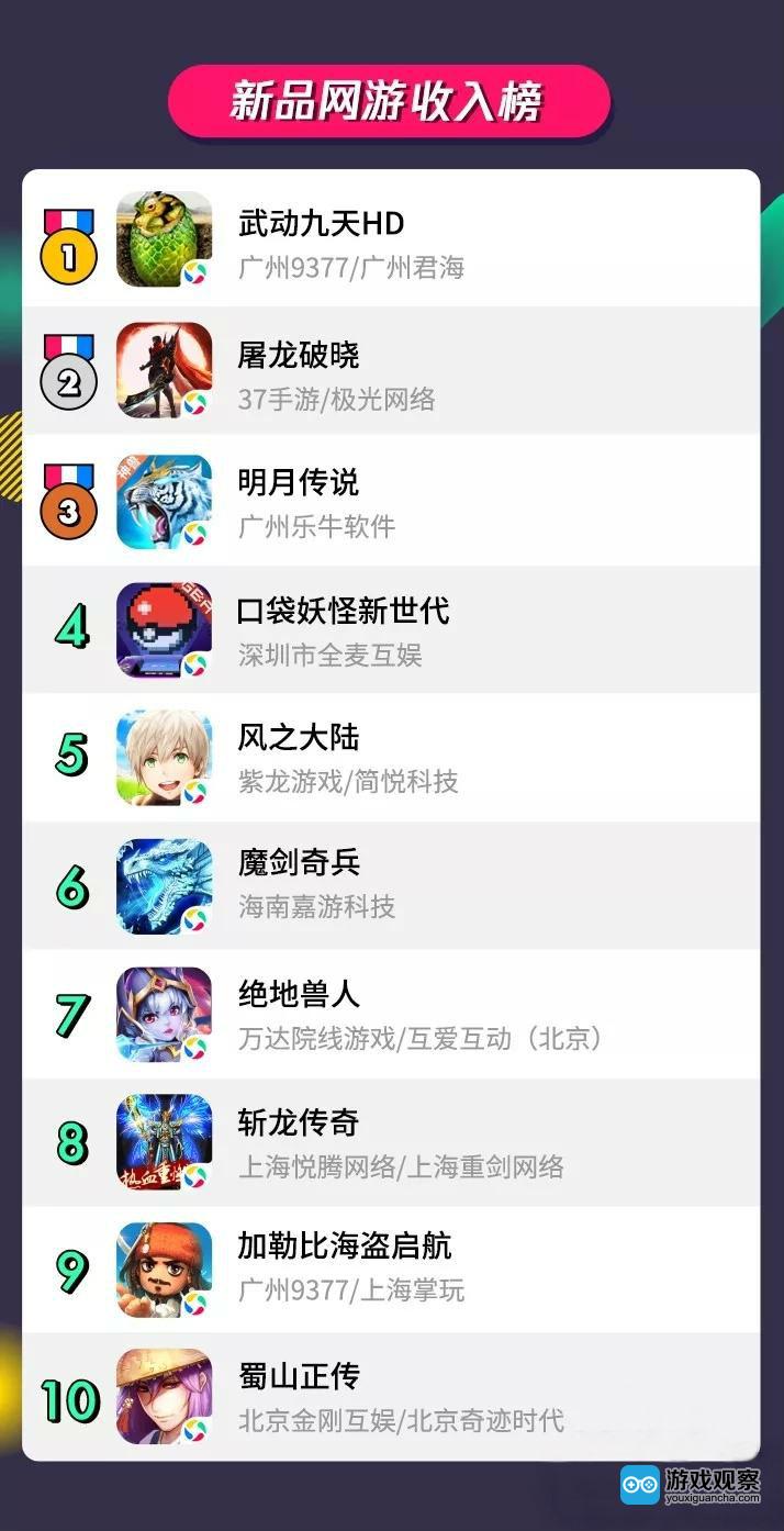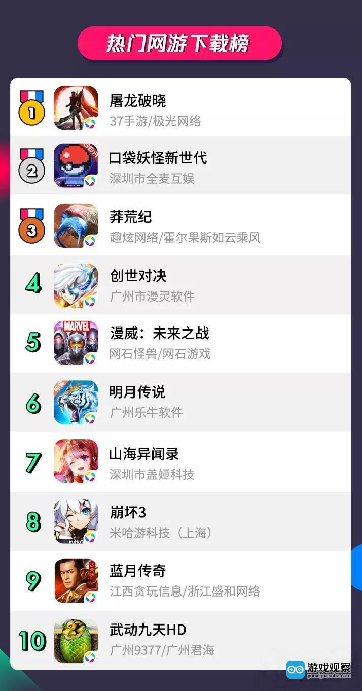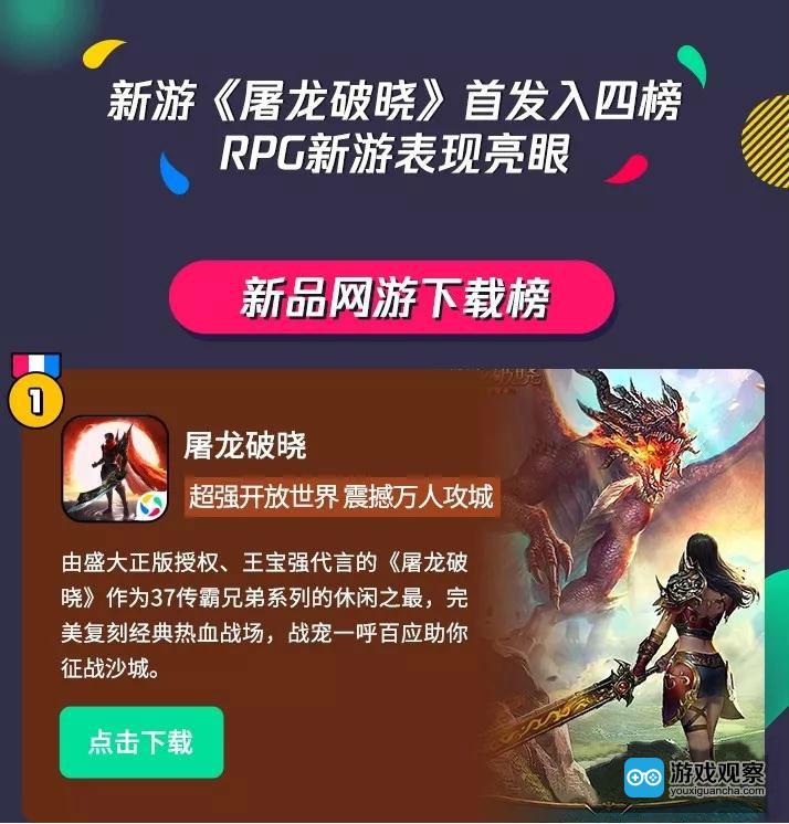 RPG新游《屠龙破晓》《口袋妖怪新世代》吸量吸金强劲,由盛大正版授权的《屠龙破晓》首发入四榜。《口袋妖怪新世代》是深圳市全麦互娱推出的一款完美还原GBA经典像素风格,全面复刻原版剧情以及玩法的口袋妖怪题材手游。