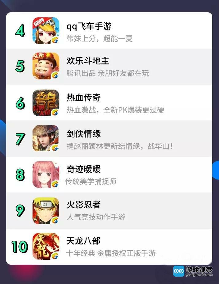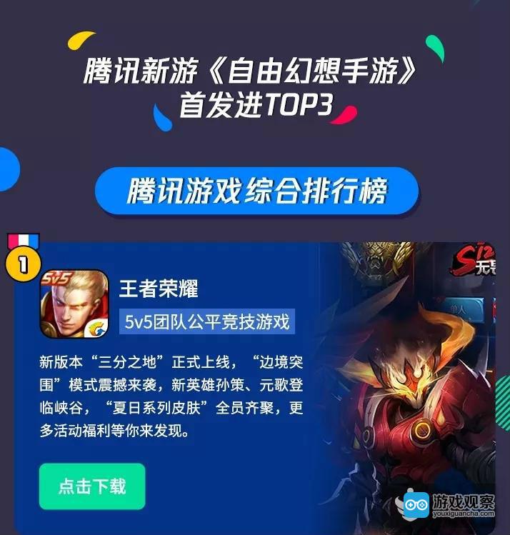 《王者荣耀》依然强势,成功登顶腾讯榜榜首。由腾讯游戏光子工作室群自主研发,幻想端游原班人马倾力打造的腾讯首款有爱社交MMORPG手游《自由幻想》首发位居腾讯榜第二名。