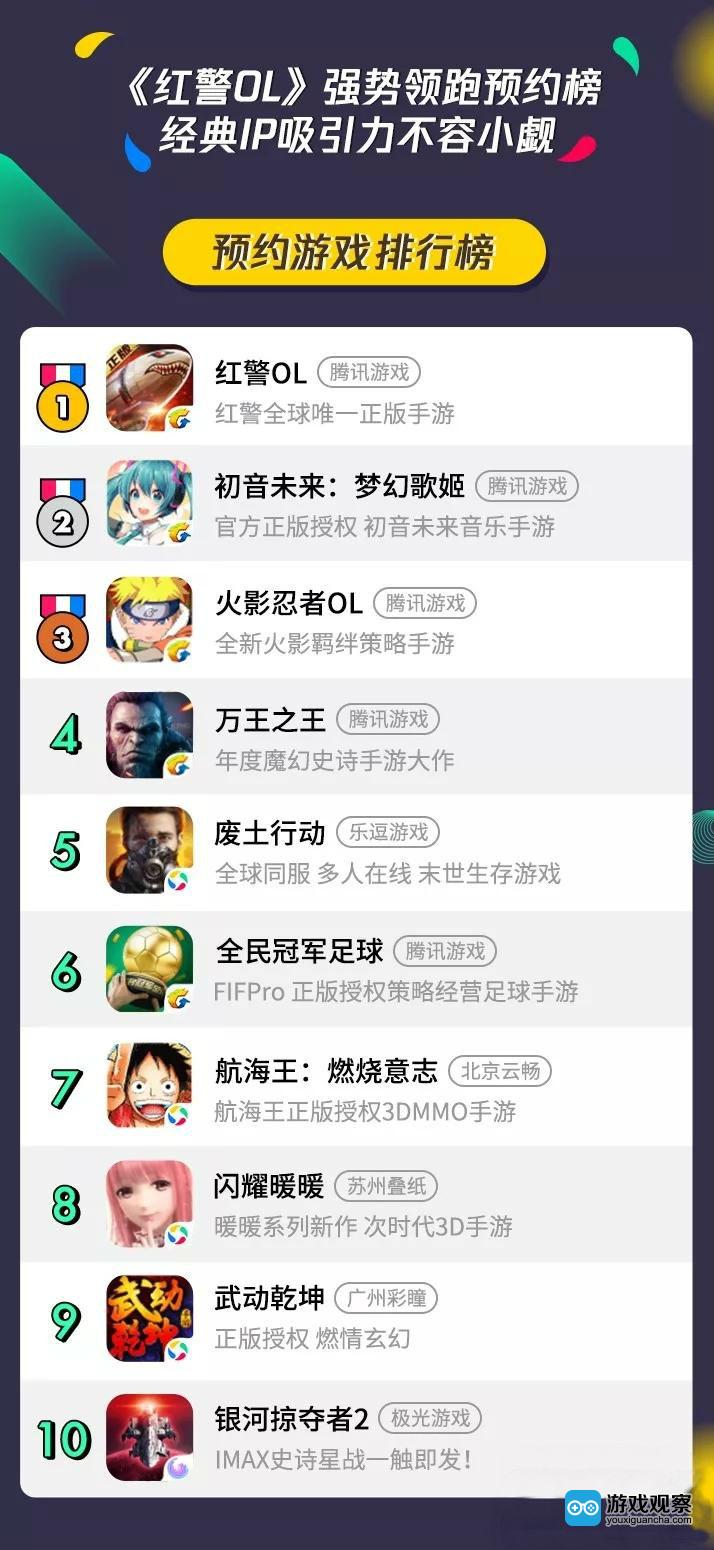 其中,腾讯推出的策略类游戏《红警OL》强势领跑预约榜,音乐类游戏《初音未来:梦幻歌姬》紧随其后,还有PRG、生存、体育、换装、回合、星战.....多种品类争相上榜,极大的丰富了手游市场,期待它们上市后的精彩表现。